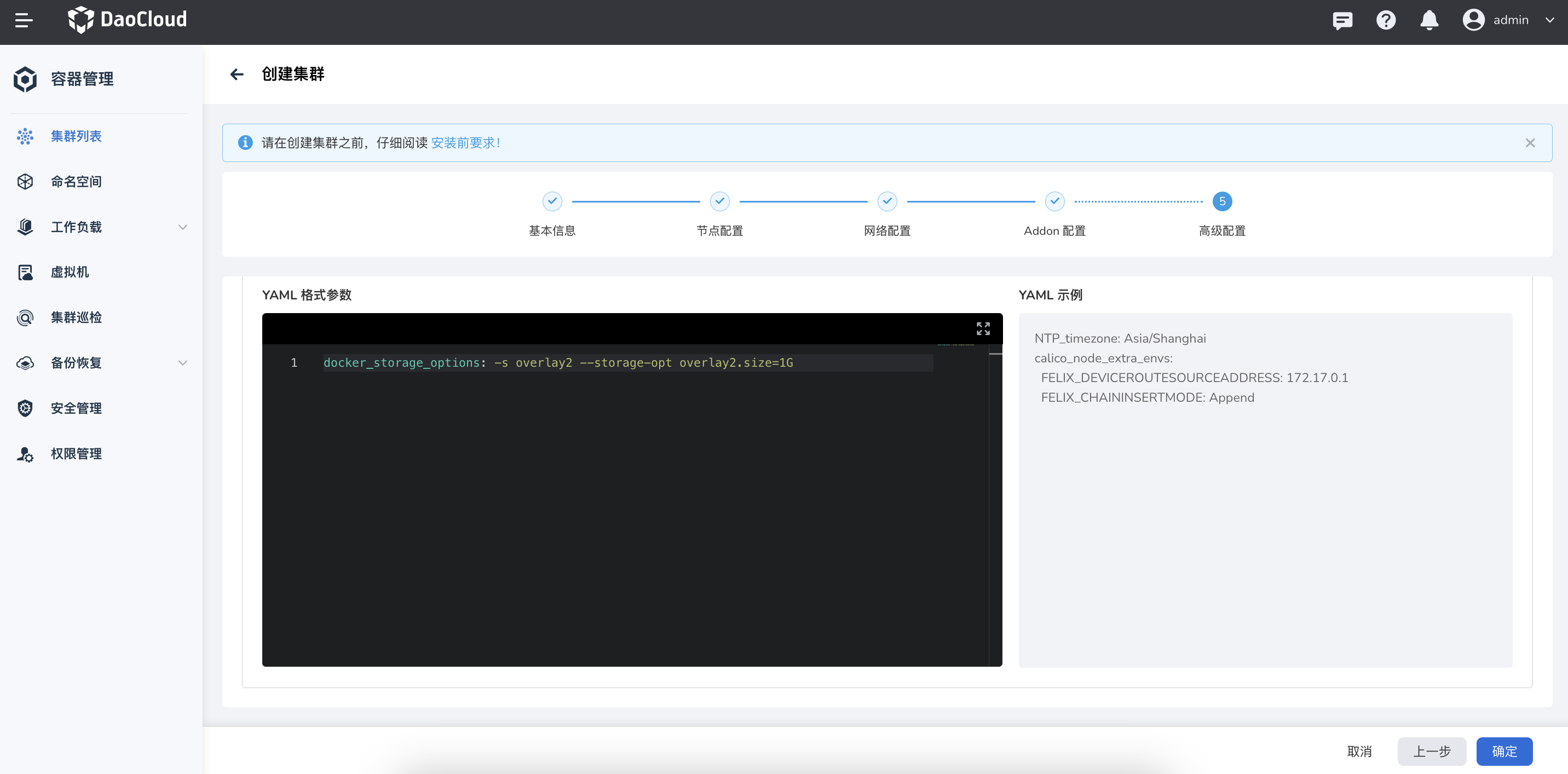参考容器管理创建集群,其他信息填写完毕后进入到 高级配置 模块